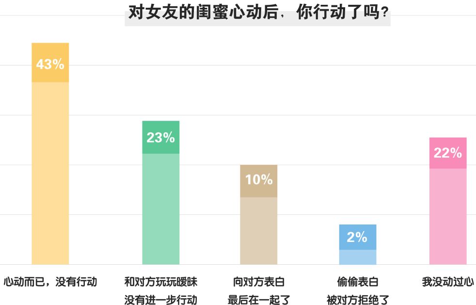 是的,大部分有心没胆,但采访中10%的男性居然成功地和女朋友的闺蜜在一起了。意思是每十个菇凉中就会有一个成功让男票和闺蜜搞在了一起。
