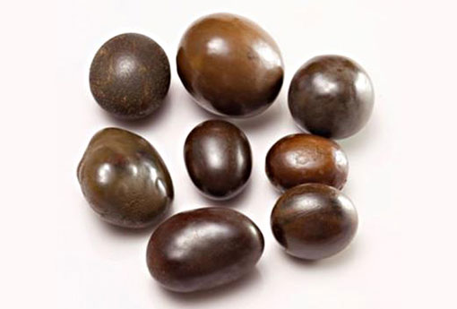 【性状】 呈椭圆形,略侧、枣,大小相差悬殊,大者如鸡卵,小者仅如黄豆,一般如莲子大。表面青铜色或绿黑色,平滑而有光泽。质硬而脆,击之易碎;断面灰黄色,有层次,中央有核。气微香,味微苦涩,嚼之有砂性。以个大、色深、质脆者为佳。