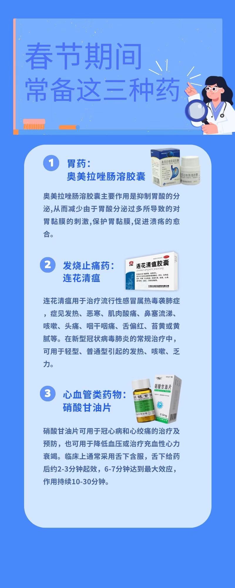 1、胃药。节日期间每天都是大鱼大肉,难免肠胃会出现问题,诸如胃胀胃痛、消化不良等症状时有发生,因此可以准备一些助消化、缓解腹胀腹痛的药物,可以有效缓解胃部不适。