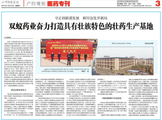 除注重产品质量外,双蚁药业还积极布局品牌宣传,建立品牌软实力。自 2020年起,该公司品牌陆续登上CCTV-1、CCTV-2、CCTV-7、CCTV-13、CCTV-17 等多个频道宣传,强势抢占品牌传播制高点。质量和品牌的双重发力,为双蚁药业在医药市场的腾飞插上翅膀。