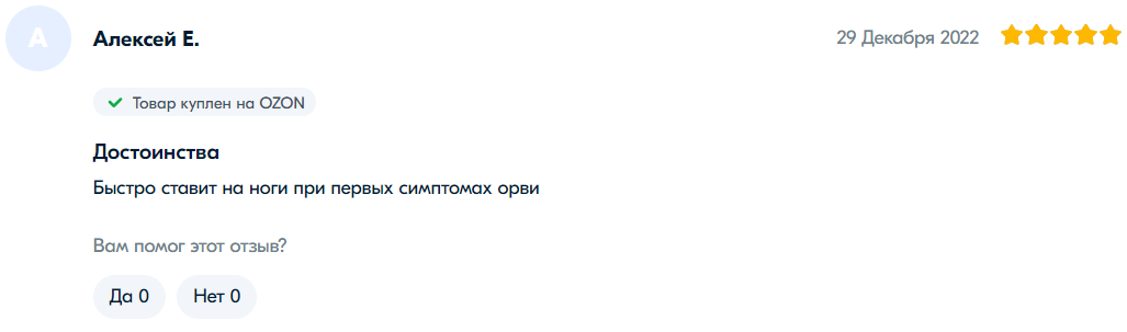 网友“谢尔盖”是前十页评论中唯一认为连花清瘟无效的。他给出了一星评价并表示:“我在出现症状时开始服用,但体温仍然升至38.6度。按照说明书吃了4天,每天12粒(4粒每天3次)后并没有好转。我决定停用并采取其他方法治疗。现在我躺在床上,喉咙剧痛。它可能对很多人有帮助,但并不是万能的。无论如何,选择权在您。我为自己做出了选择。”