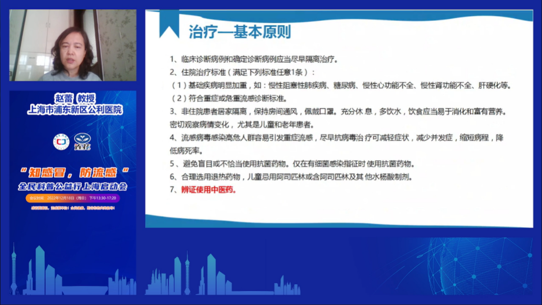 “全球流感虽然在新冠疫情期间显著受到抑制,但其对人类健康构成的巨大的威胁仍不容忽视。”王晓如教授详细介绍了普通感冒、流感、新冠的鉴别诊断,并表示保持社交距离、注意个人防护、接种疫苗等,是预防流感等呼吸道病毒感染性疾病最有效手段和最具成本效益的方法,一旦感染,早诊早治是关键的治疗原则。