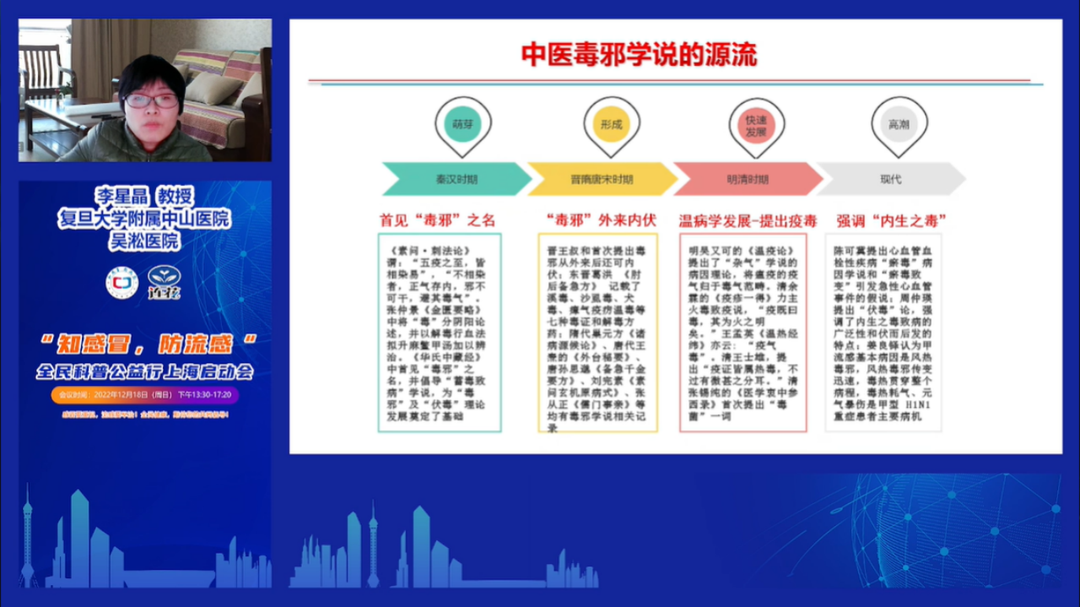 “化学药物治疗病毒感染面临着耐药性和副作用两大挑战,需要合理联用抗炎药物。”李星晶教授从中医毒邪学说入手,阐述了以新冠肺炎为代表的呼吸道病毒感染性疾病的发病机制,她表示,中药可有效降低轻型-普通型病例转为重症的风险,缩短病毒清除时间、临床症状缓解时间和患者住院时间,且耐受性和安全性良好。这其中,以连花清瘟为代表的中医药在疫情防控中做出重要贡献。