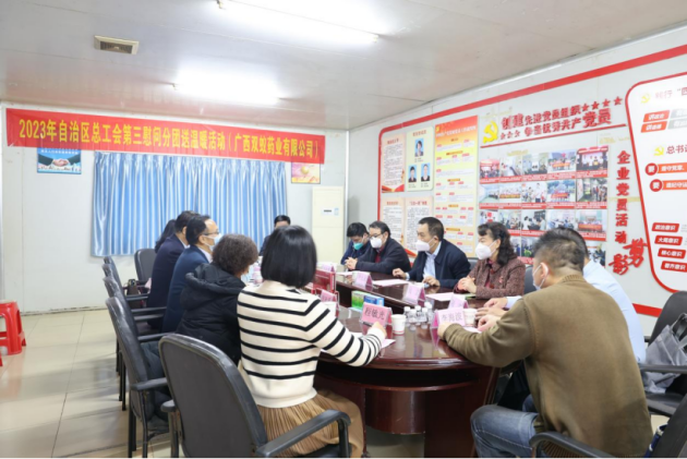 慰问团深入双蚁药业党建工作室、生产车间、成品仓库等,现场了解企业生产经营状况、工会工作情况和职工工作生活、收入情况,并向企业工会赠送温暖慰问金2万元,为自治区劳动模范曾秋菊及一线职工送上春节慰问品、慰问金和新春祝福,把党和政府的关心关爱以及工会组织的温暖送到企业、送到一线职工的心坎上。并与企业负责人王波董事长和一线职工代表进行座谈交流。