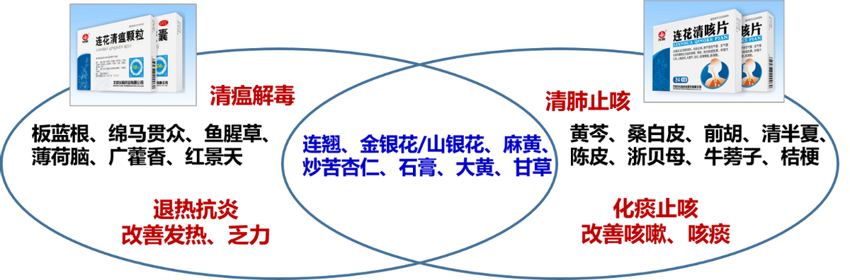 其中,连花清瘟以东汉张仲景《伤寒杂病论》麻杏石甘汤与清代吴鞠通《温病条辨》银翘散为基础方,汲取明代吴又可《温疫论》治疫病用大黄的用药经验。而连花清咳片融汇了东汉张仲景麻杏石甘汤宣肺泄热,明代叶文玲清金化痰汤清泄肺热、化痰止咳,配伍山银花、连翘、牛蒡子清热解毒,大黄通腑泄肺,具有“宣肺泄热、止咳化痰”的功效。