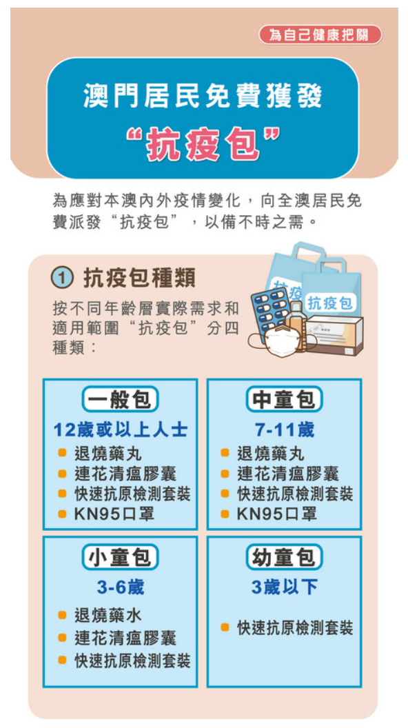 据悉,“抗疫包”已于12月8日起优先派发给本澳弱势群体,12月14日至18日开展的第二阶段派发工作,对象则为其他合资格人士,并按不同年龄层的实际需求和适用范围分“一般包”、“中童包”、“小童包”及“幼童包”等4个种类。