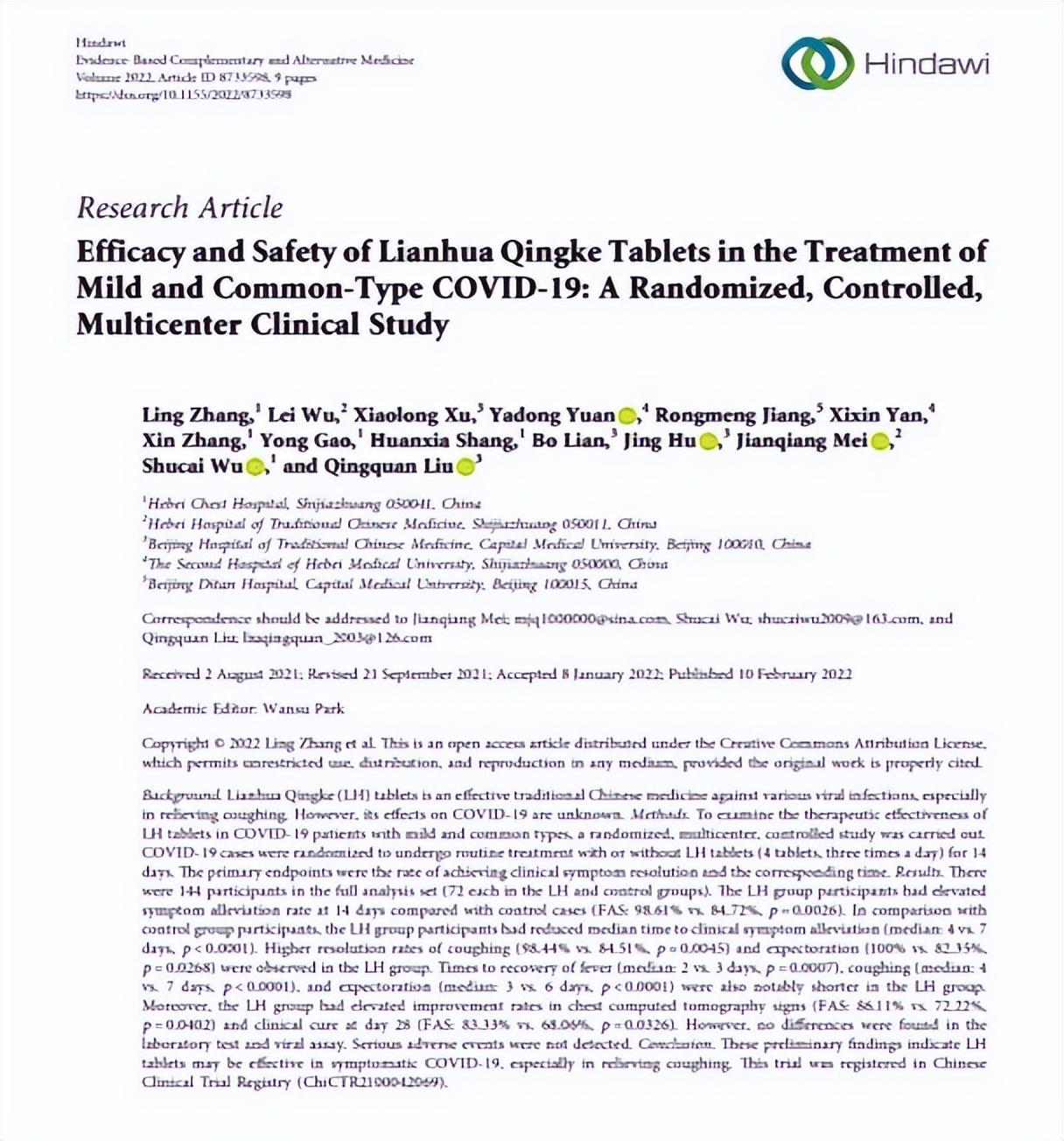 在今年3月,国际学术期刊《循证补充和替代医学》刊发了一篇题为《连花清咳片治疗轻型、普通型COVID-19的疗效和安全性的随机对照多中心临床研究》的科研论文。该研究表明,连花清咳片治疗新冠肺炎较对照组,临床症状缓解率可达到98.61%,咳嗽咳痰缓解中位时间分别缩短3天,胸部CT表现改善率提高14%。连花清咳片可明显改善新冠肺炎患者咳嗽咳痰症状,提高呼吸功能,减轻肺损伤。
