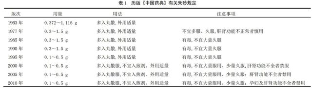 中医药学对朱砂的认识经历了从“无毒”到“有毒”的变化过程。《神农本草经》将其列为上品,认为其能强身健体,但同时也指出了朱砂在一定条件下有可能转化为有毒的水银,表明我国古代对朱砂的毒性变化关系和转化条件已经有了一定的认识。尽管受当时历史条件和科技水平的限制,古代医家还是从临床实践中总结出“朱砂多服令人痴呆”“独用多用,令人呆闷”的科学论断,这与现代医学中关于汞的慢性蓄积可引起神经系统毒性的研究结果不谋而合。为降低朱砂毒性,业界对朱砂的用量呈现逐渐减少趋势,并明确指出了用法用量和宜忌使用的人群,使朱砂的使用趋于规范和安全,这种变化可以从历版《中华人民共和国药典》(以下简称《中国药典》)中所载朱砂的内容中看出,见表1。