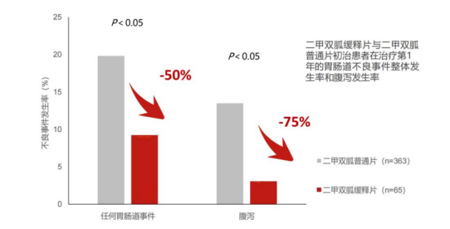 一项以二甲双胍原研药缓释片为治疗药物的美国回顾性研究显示,起始用二甲双胍原研药缓释片可使胃肠道不良事件发生率减少50%,腹泻事件发生率减少75%[4]。
