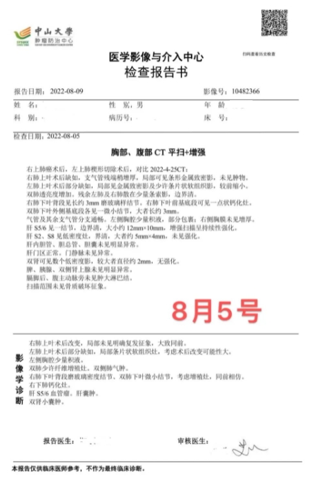 2022年8月,经过两个疗程细胞治疗后的CT检查,肺部局部未见明确复发征象,大致同前。时隔一年多,病情稳定未进展,未发生转移复发,细胞治疗的作用功不可没。