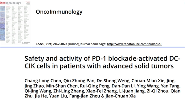夏建川教授团队进行了一项探索性研究,第一个在晚期实体瘤患者中使用过继性细胞治疗(DC-CIK)与PD-1/PD-L1阻断相结合的研究。临床研究成果发表在国际权威杂志OncoImmunology上,引人注目的是,结果表明,这种新策略具有良好的抗肿瘤效果和令人满意的临床反应,31名患者中有7名实现了客观的肿瘤消退。