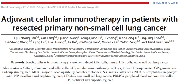 夏建川教授团队在国际知名期刊《肿瘤免疫学(OncoImmunology)》上,夏建川教授团队发表抗肺癌的临床研究成果Adjuvant cellular immunotherapy in patients withresected primary non-small cell lung cancer表明:CIK、NK细胞交替应用的辅助性细胞免疫治疗(CIT)联合术后化疗,可增强化疗疗效、改善预后、有效延长患者生存期。