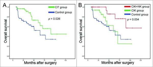 研究中包括的所有120名患者都进行了总体生存率评估。所有患者的中位随访时间为33.0个月(范围为8-127个月)。CIT组1年、3年和5年总生存率分别为96.4%、88.1%和67.8%,对照组分别为91.2%、65.9%和52.2%。接受辅助CIT的患者总生存率优于对照组(图A;p=0.026)。进一步分析发现,CIK+NK组患者的预后明显优于CIK组(图B;p=0.034)。