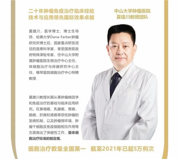 中山大学附属肿瘤医院生物治疗中心主任夏建川教授,是体细胞治疗标准的制定者,领衔组建专业的临床研究及应用团队,依托于横琴、南沙自贸区细胞治疗先试先行的政策,开展细胞治疗临床应用。更多细胞治疗资讯及患者案例,关注公众号“夏建川教授团队”。