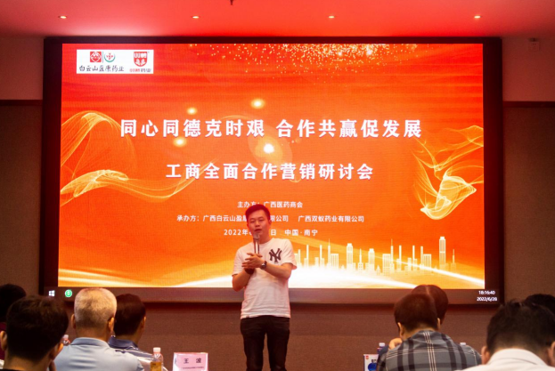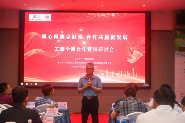 鎏金六月,骄阳似火,6月28日,广西医药健康行业的制药工业,零售连锁企业齐聚绿城南宁,共谋行业发展大计,共商合作共赢良策。本次工商全面合作营销研讨会主题为“同心同德克时艰 合作共赢促发展”,由广西医药商会主办,广西白云山盈康药业有限公司和广西双蚁药业有限公司共同承办。