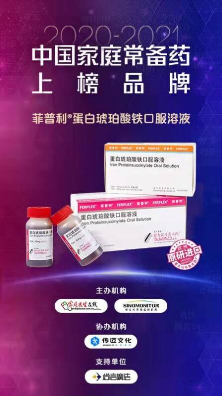 被誉为“家庭常备药品风向标”的“2020~2021年中国家庭常备药上榜品牌”荣誉榜单线上重磅发布!在历经6个多月的渠道申报、市场调查、专家评审、人气好评、榜单公示等环节后选出了109个医药产品,其中包含了28个类别,为每个中国家庭提供了更为全面且权威的常备药购买参考。“2020-2021中国家庭常备药上榜品牌”由家庭医生在线与新生代市场监测机构联合主办,旨在以综合榜单评定的形式,呈现国内市场的优质医药产品,辅助广大消费者完善家庭常备药箱,老百姓提供购药指引,也推动了优秀医药行业良性发展。超30年全球妇儿的补血金标准——菲普利蛋白琥珀酸铁口服溶液上榜“中国家庭常备补益用药”榜单。