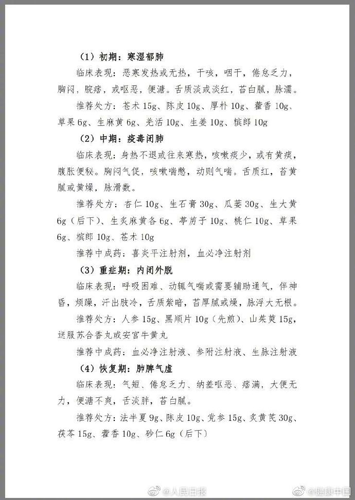 (1)初期:寒湿郁肺。临床表现:恶寒发热或无热、干咳、咽干、倦怠乏力、 胸闷、脘痞,或呕恶,便溏。舌质淡或淡红,苔白腻,脉濡。推荐处方:苍术15g、陈皮10g、厚朴10g、藿香10g、草果6g、生麻黄6g、羌活10g、生姜10g、槟郎10g。