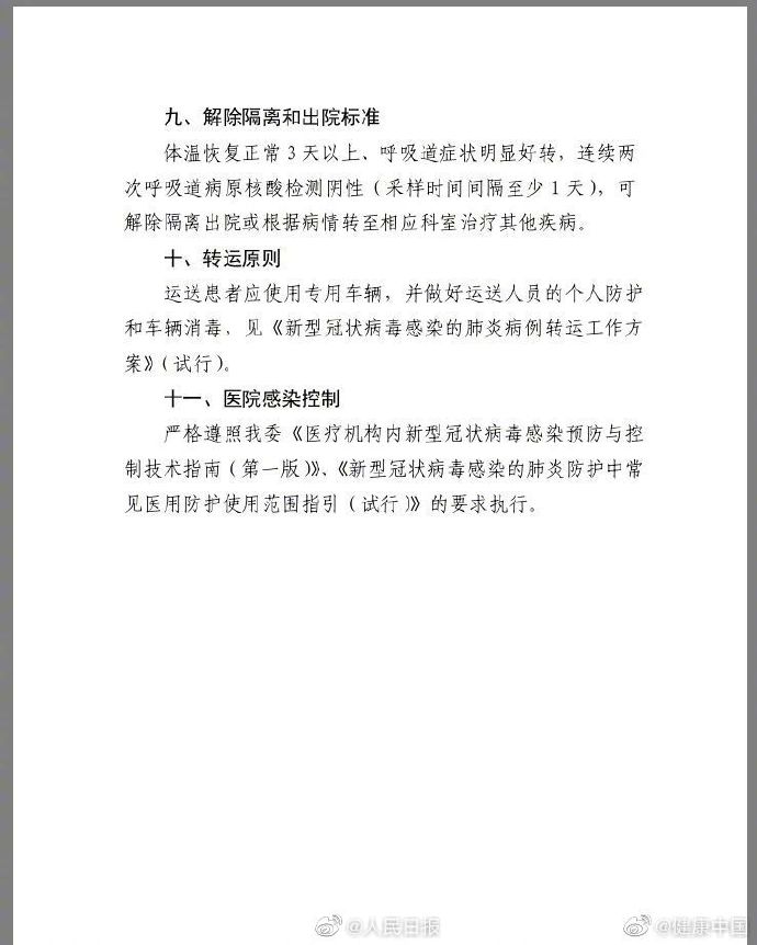 体温恢复正常3天以上、呼吸道症状明显好转,连续两次呼吸道病原核酸检测阴性(采样时间间隔至少1天),可解除隔离出院或根据病情转至相应科室治疗其他疾病。