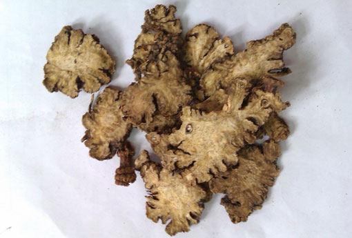 【药材】根茎呈不整齐结节状拳形团块,长4~8厘米,直径4~6厘米。表面深黄棕色,有明显结节状起伏轮节,上侧有很多圆形或卵圆形的茎痕,直径5~15毫米,作凹洼状,下侧及轮节上有众多根痕,作小瘤状隆起。质坚实,断面类黄色,形成层呈明显环状,随处散有黄色小油点。有特异清香气味苦。 主产四川(灌县、崇庆)。云南亦产,称作"云芎"。