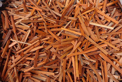 【性状】本品呈长圆柱形或对剖半圆柱形,长10~100cm,直径3~12cm。表面黄红色至棕红色,具刀削痕,常见纵向裂缝。横断面略具光泽,年轮明显,有的可见暗棕色、质松、带亮星的髓部。质坚硬。无臭,味微涩。