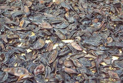 宽水蛭:呈扁平纺锤形,全体由许多环节组成,长5~9厘米,宽0.8~2厘米,常腹背相贴而呈拘挛状。体前端稍尖,后端钝圆,前吸盘不显著,后吸盘较大。背面黑棕色。体两侧及腹面为棕黄色。质脆,易折断,断面角质样。有腥气。