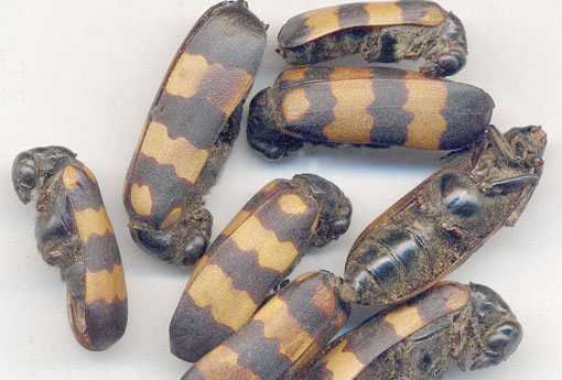 【性状】南方大斑蝥:呈长圆形,长1.5~2.5cm,宽0.5~1cm。头及口器向下垂,有较大的复眼及触角各1对,触角多己脱落。背部具革质鞘翅1对,黑色,有3条黄色或棕黄色的横纹;鞘翅下面有棕褐色薄膜状透明的内翅2片。胸腹部乌黑色,胸部有足3对。有特殊的臭气。
