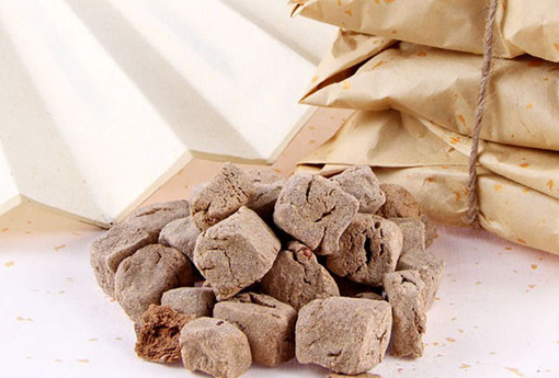 【形态特征】:本品呈方形或长方形的块状,宽约3cm,厚约1cm,外表土黄色,粗糙;质硬脆,易断,断面不平整,类白色,可见未被粉碎的褐色残渣及发酵后的空洞。有陈腐气,味苦。以身干、陈久、无虫蛀、杂质少者为佳。
