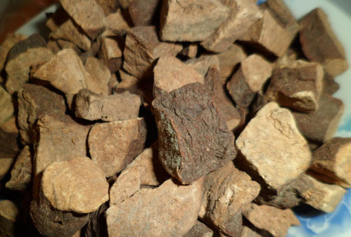 【药材】何首乌(赤首乌)干燥块根呈纺锤形或块状,长约6~15厘米,膨大部直径3~12厘米,外表红褐色或紫褐色,有不整齐的纵沟,凹凸不平,两端各有一根痕。质坚,显粉性。横断面淡红棕色或淡黄棕色,中心为一个较大的木心,周围有数个类圆形的异形维管束,形成云锦状花纹;干后收缩而有稍突起的皱纹。气无,味苦涩。 以质重、坚实、显粉性者为佳。 主产河南、湖北、贵州、四川、江苏、广西等地。此外,浙江、安徽、广东、山东、江西、湖南亦产。 《开宝本草》记载,何首乌有赤、白之分。现代药材,除上述蓼科之赤首乌外,少数地区亦有应用白首乌者。白首乌主要为萝藦科植物大根牛皮消的块根,参见"白首乌"条。此外,江苏(南京)亦有用耳叶牛皮消之块根者,参见"隔山消"条。