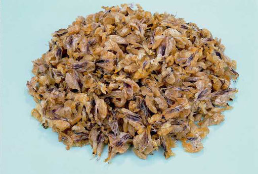 【性状】 本品呈不规则块状,弯曲而重叠,长1.5~2cm,厚1.5~5mm。表面黄白色,呈脂肪样光泽,偶有带灰白色薄膜状干皮。摸之有滑腻感,在温水中浸泡体积可膨胀。气腥,味微甘,嚼之有黏滑感。