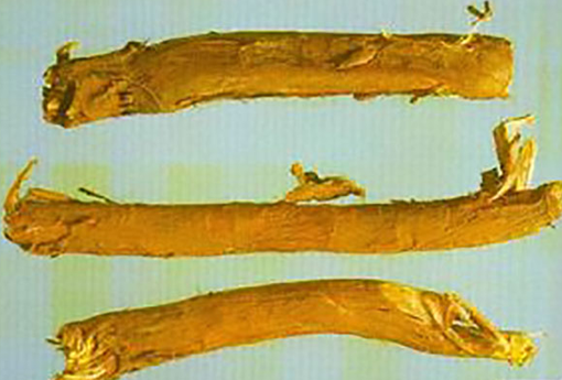 药材性状:本品呈圆柱形,略弯曲,长8~25cm,直径0.5~1.5cm。表面红棕色或灰棕色,有纵皱纹及根痕。外皮粗糙,易成片状剥落。根茎具节,节间长0.7~2cm,表面有横长突起的皮孔。体轻,质硬而,断面皮部黄白色,木部淡黄色或黄色,射线放射状,中心有髓。无臭,味微苦。